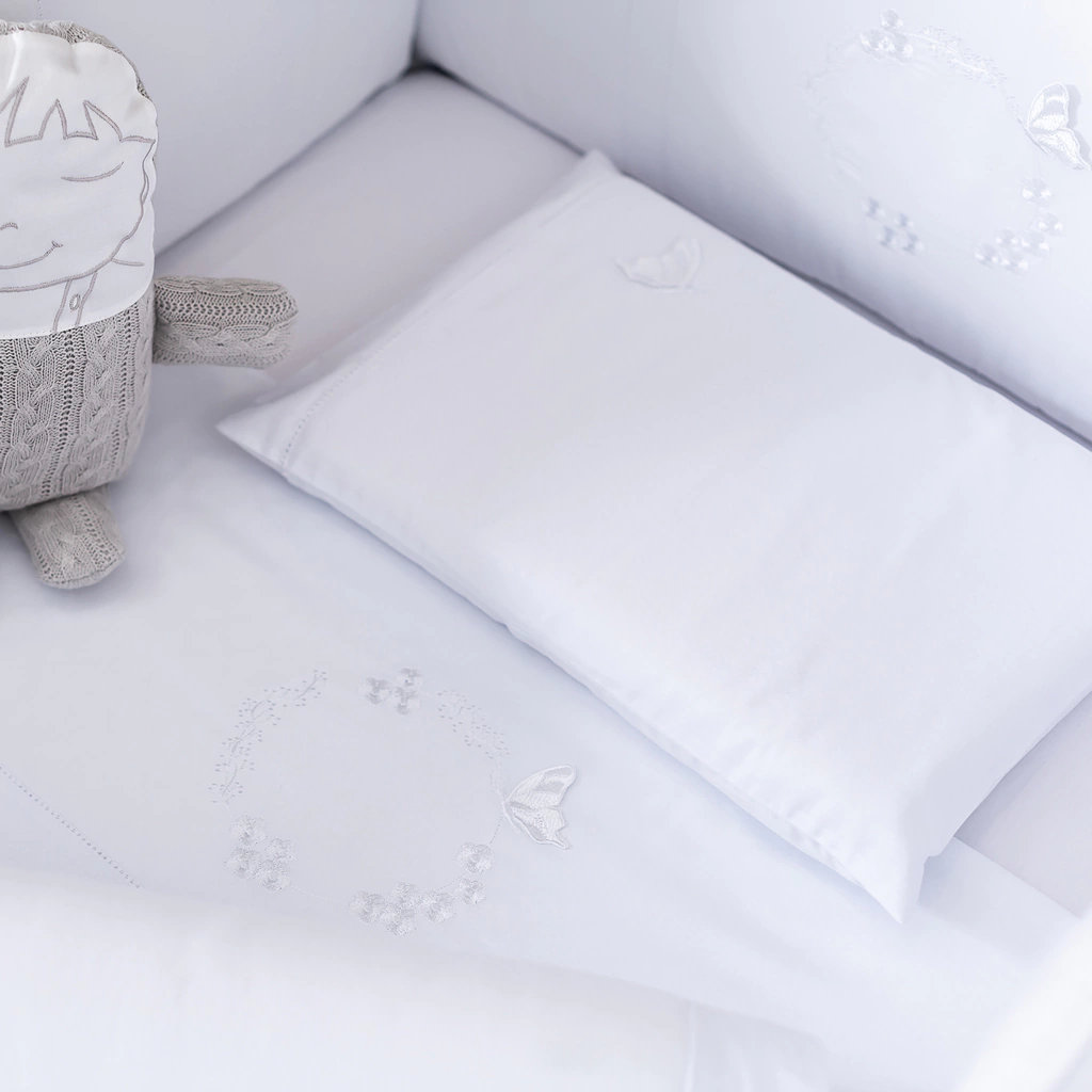 Você pode escolher seu kit bordado em tons suaves de rosa e cinza, ou em um clássico todo branquinho, combinando perfeitamente com qualquer decoração.