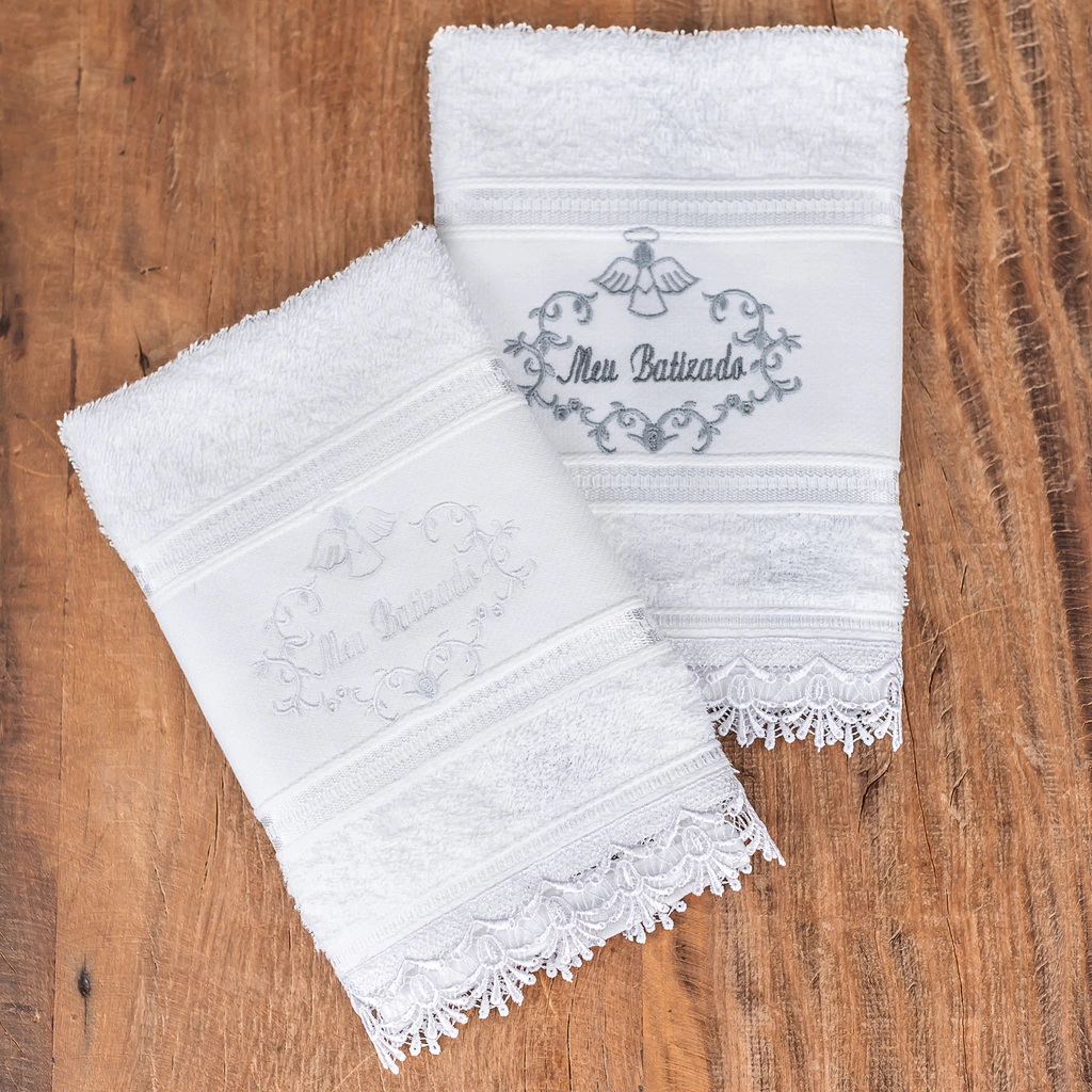 Confeccionada em toalha felpuda 100% algodão, esta toalha para batizado é a escolha perfeita para celebrar com delicadeza e conforto. Disponível nas cores branco e cinza, ela apresenta um acabamento refinado em renda, que pode variar no desenho, garantindo exclusividade e charme.