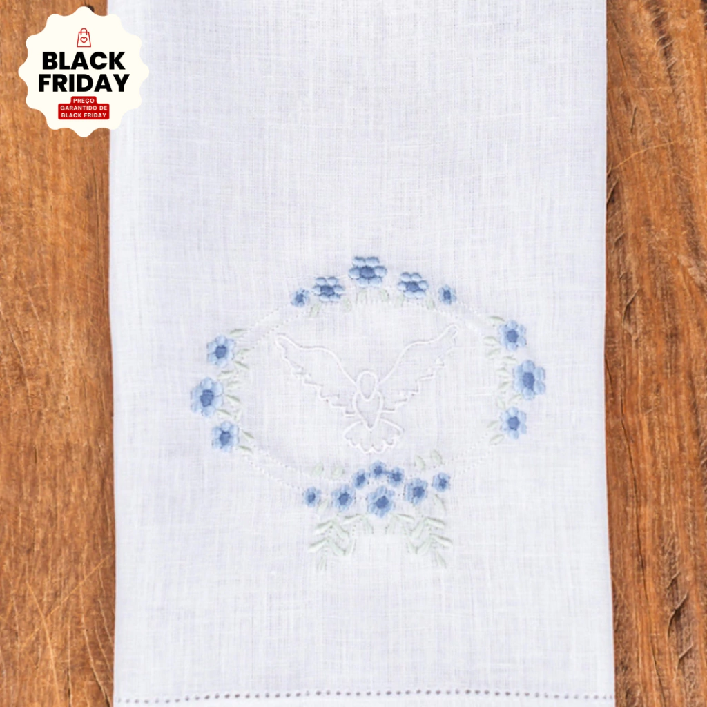 Confeccionada em linho misto 55% linho e 45% algodão, esta toalha para batizado apresenta uma textura nobre e um toque suave, perfeita para envolver o seu bebê com carinho. Medindo 47 x 71 cm, ela traz um bordado delicado do símbolo do Espírito Santo, cuidadosamente emoldurado por flores sutis, disponíveis nas cores branca, rosa clarinho ou azul clarinho — escolha a que melhor combina com o estilo do evento.